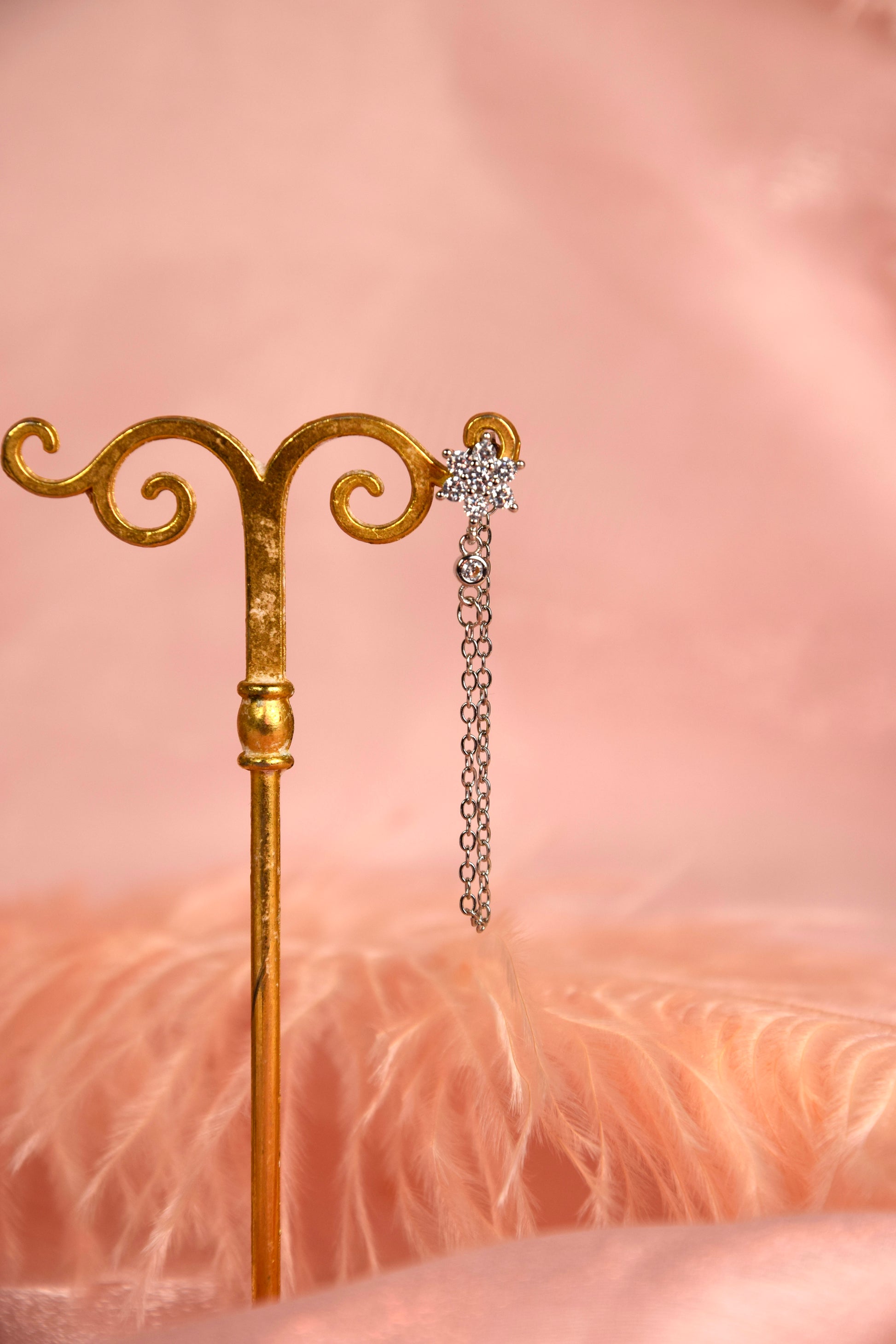 Cette pièce est faite de laiton doré à l’or fin 18k ou d’argent selon la version, et de zircon couleur Diamant.