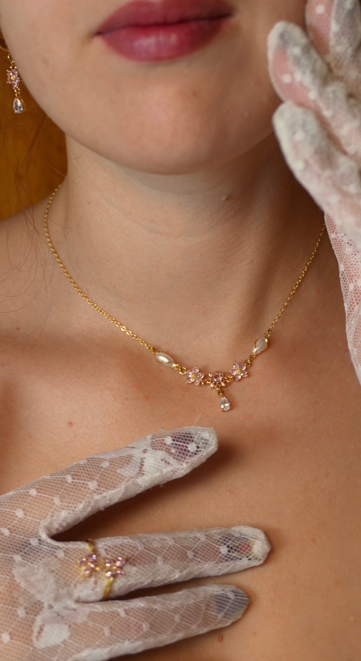 Cette pièce est faite de laiton doré à l’or fin 18k, de zircon couleur Quartz rose et Diamant, ainsi que des perles de verre.