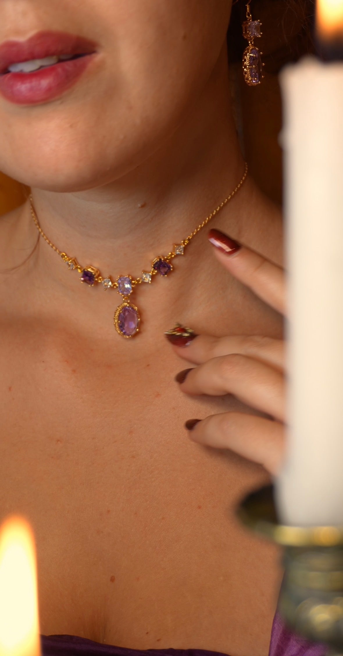 Cette pièce est faite de laiton doré à l’or fin 18k, ainsi que de zircon couleur Améthyste et Diamant.
