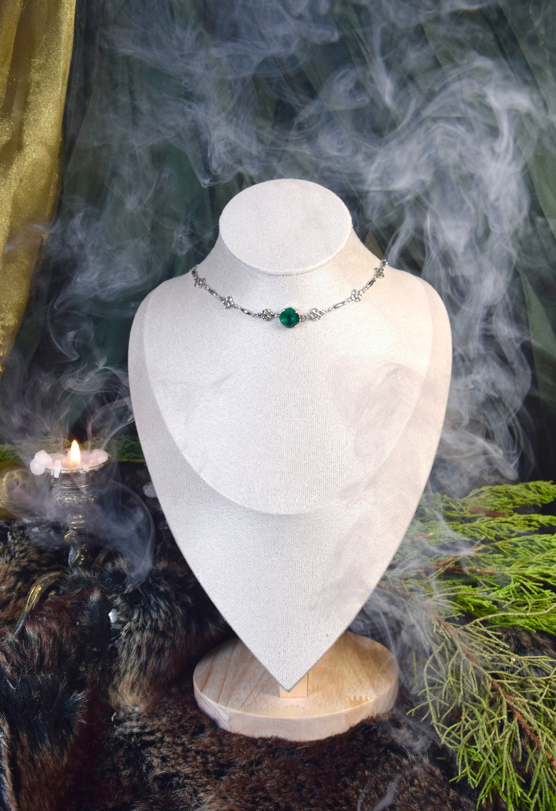 Le collier la Brume Éméraude fait parti de la collection Conte de Fée, Partie 3 : La Princesse indomptable, inspirée par Mérida et la reine celte Boadicée.