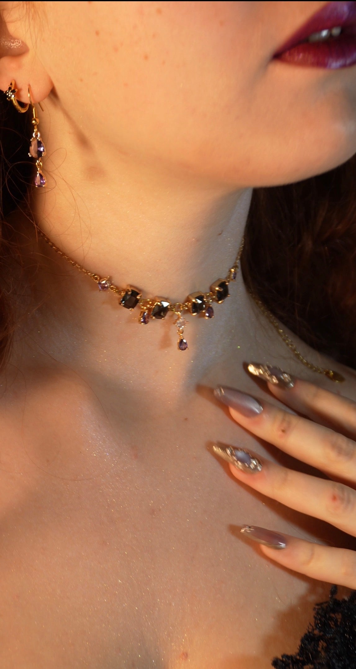 Cette pièce est faite de laiton doré à l’or fin 18k, de verre et Zircon couleur Améthyste et Onyx.